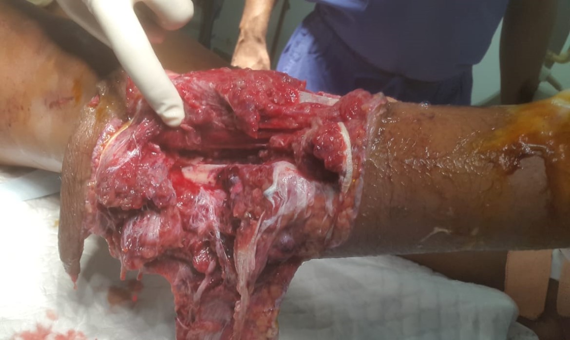 A case of open comminuted fracture of both bones leg with extensive soft tissue loss.