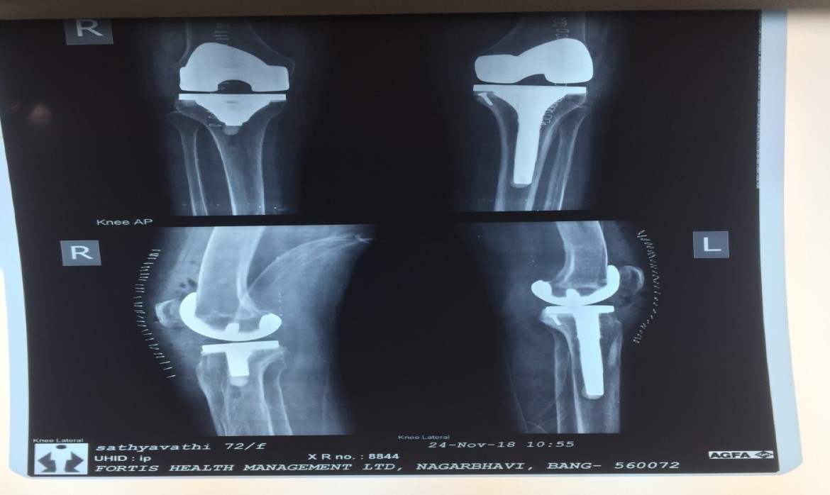 A case of bilateral severely deformed osteoarthritis of knee. Post surgery a well alligned knee.